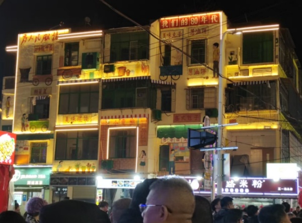 夜晚的五一路上人头攒动,非常热闹。一位正在吃冰虾的女孩告诉我们,最值得一看的是五一路精心打造的“怀旧街区”。在抵达之前,会穿过一条很有氛围感的漫步街。道路两边的行道树成为天然的载体,统一设计的氛围灯提升了街区亮化效果,营造出“树上有星光、街道有流光”的意境。与此同时,当地还对弱电、地下管网、垃圾清运等进行了系统整治,天空少了“蜘蛛网”,街面也更加干净整洁。