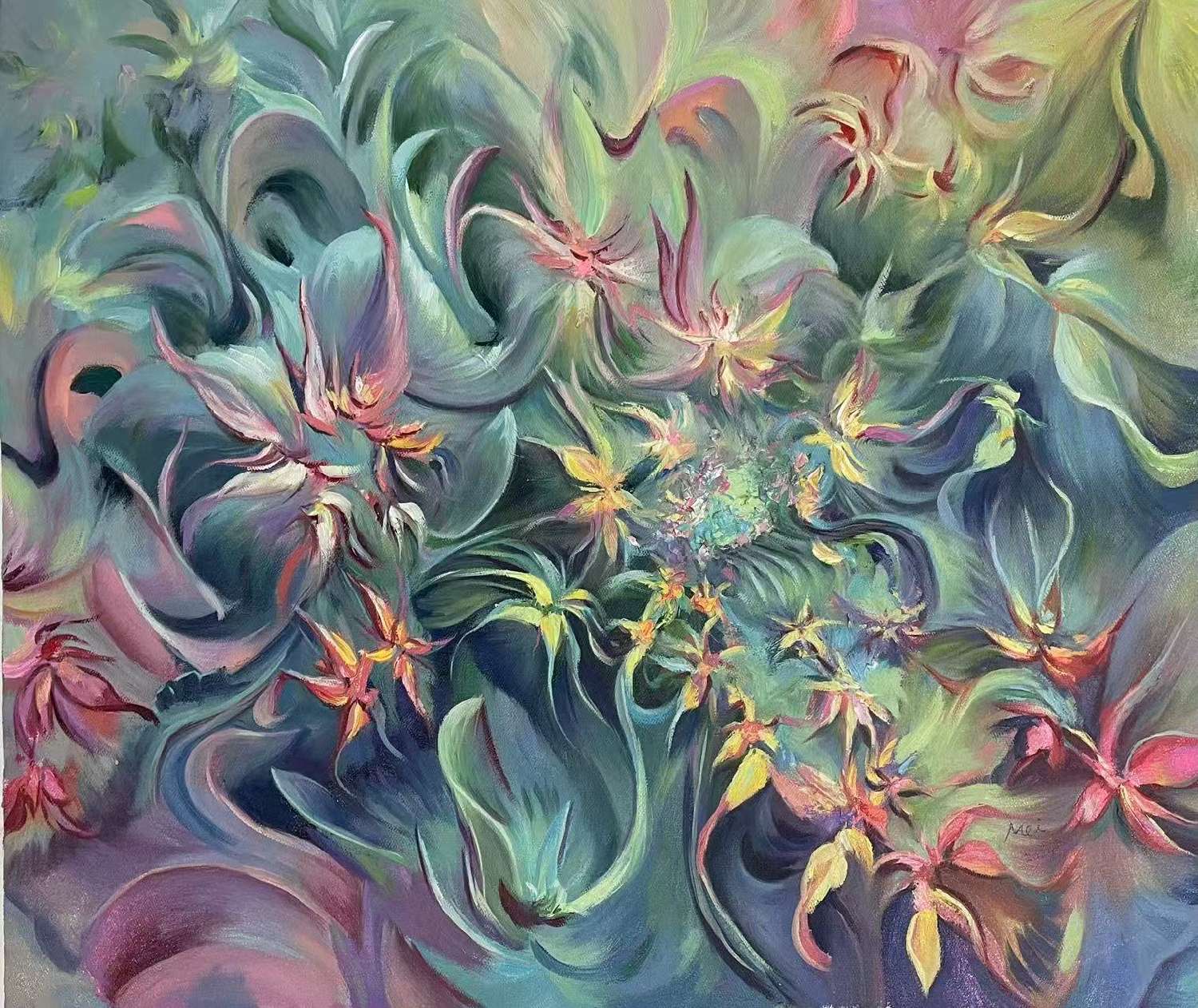 展出油画是她的代表作:《花影霓裳》《花期》《花语玄宇:生命之链》《蛇舞春荣》《蓝色静谧:暗夜之美》《心中的太阳》《二月春意》和《怒放》。这些作品颇具“万物有灵”的东方精神内核。植物的“无限复制”象征着生命的延续和循环。通过描绘植物这一微小的生命,梁东梅试图展现生命与自然之间的紧密联系,以及精微的宇宙秩序。