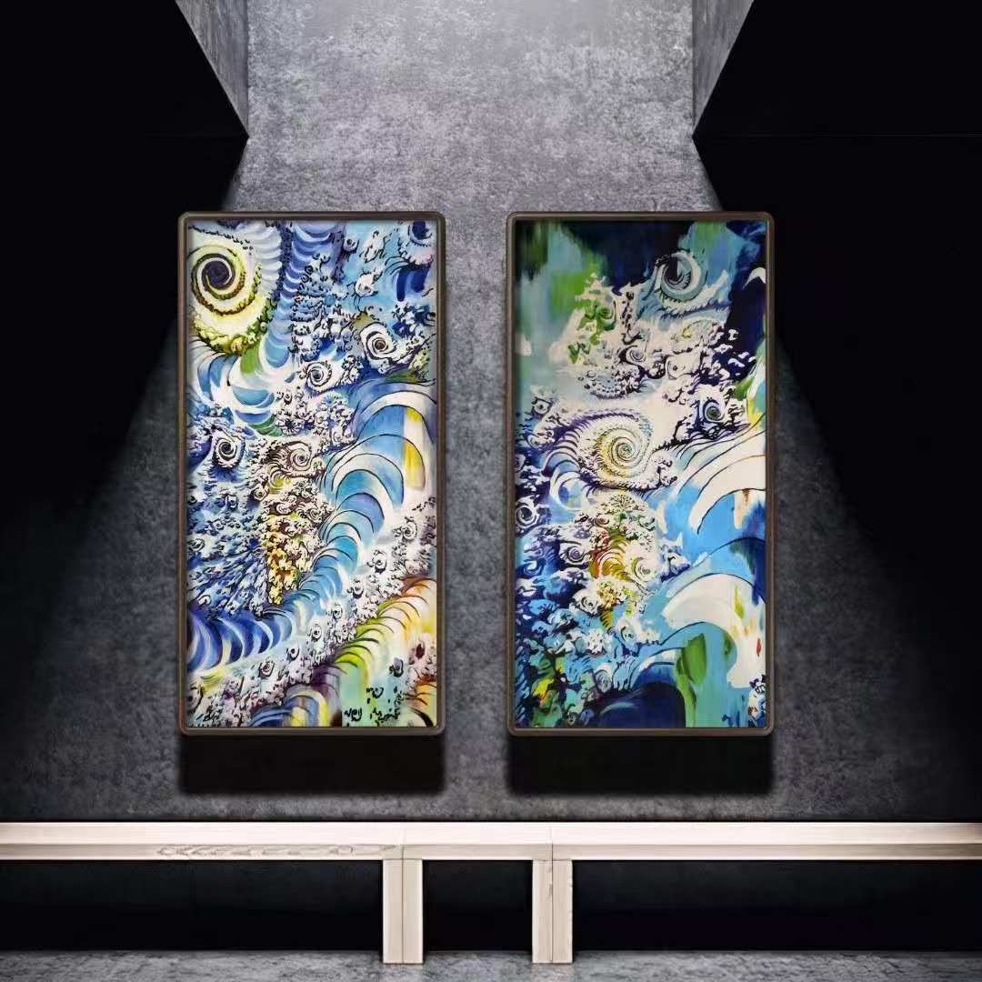 《蝶恋花》系列作品之一而“将科学概念融入绘画肌理”,使她的作品在视觉上呈现出极强的动态张力。《蓝眼睛》系列以科学概念为原点,结合厚涂技法与象征主义结构,建构出一种“触觉性”的宇宙意象系统。作品中量子色层、能量流动与光线处理,带有明显的方法论实验色彩。中国工艺美术大师葛军指出:“这种融合艺术与科学的跨界方法论,已经不只是风格探索,而是对视觉艺术‘语法体系’的一次结构性贡献。”