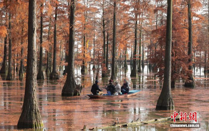 12月14日,湖北武汉,位于新洲区的涨渡湖湿地在冬日呈现出独特的自然奇观。万余棵池杉树叶金黄,色彩斑斓的“水上森林”鹭鸟翔集,林水相依,构成一幅色彩斑斓的生态画卷。图为游客乘船在涨渡湖湿地“水上森林”中游玩。中新社记者 张畅 摄