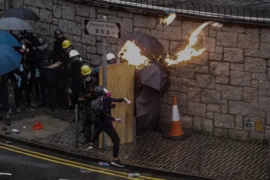 Protesters hurl gasoline bombs at police officers on Harcourt Road in Hong Kong on Saturday. (Photo/China Daily)