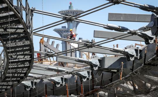 Employees of State-owned Beijing Urban Construction Group work on the construction site of a sports facility in Beijing. (Photo by Kuang Linhua/China Daily)