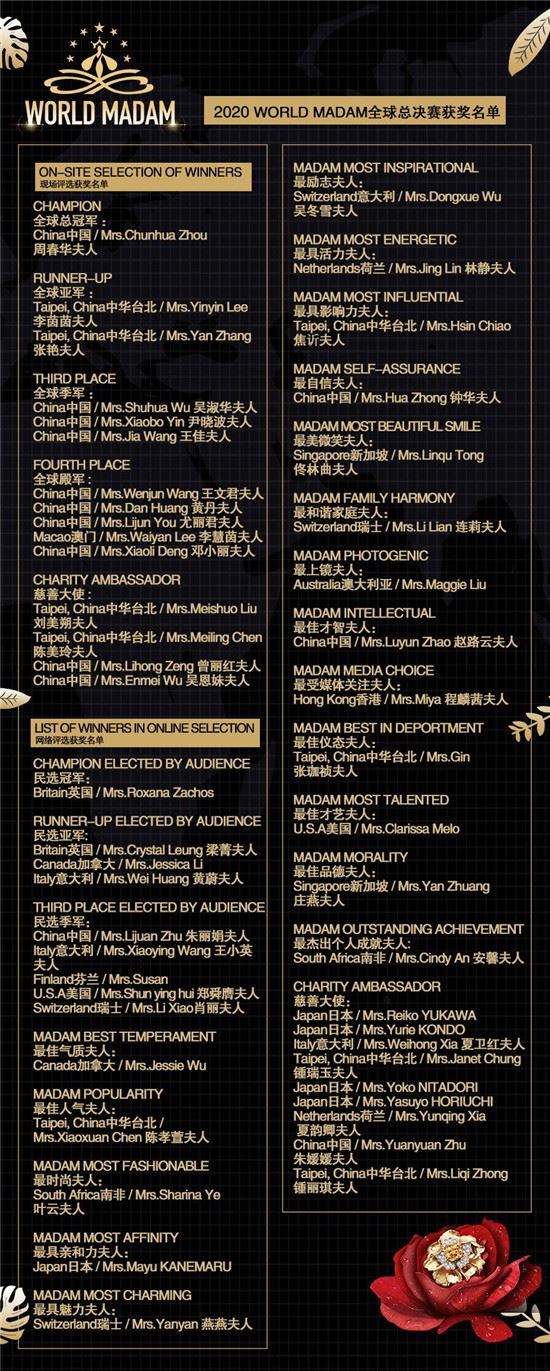 Madam Lisa Chen, Chairwoman of the World Madam judging panel and Global Executive Chairwoman, once again explained the significance of WORLD MADAM events before the Awards Ceremony, Looking back to the 2020 World Madam division competitions and looking forward to 2021, she appreciated the sacrifices of all the people involved.