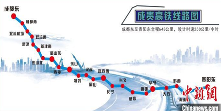 成贵高铁起于四川省成都市,途经眉山市、乐山市、宜宾市,云南省昭通市威信县、镇雄县,以及贵州省毕节市,终至贵阳市。线路全长648公里,设计时速250公里。其中,成都至乐山段已于2014年底开通运营,乐山至宜宾段2019年6月开通运营。此次开通的宜宾至贵阳段全长372公里,设宜宾西、长宁、兴文、威信、镇雄、毕节、大方、黔西、清镇西、白云北、贵阳东11座车站,初期运营时速250公里。